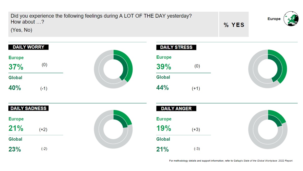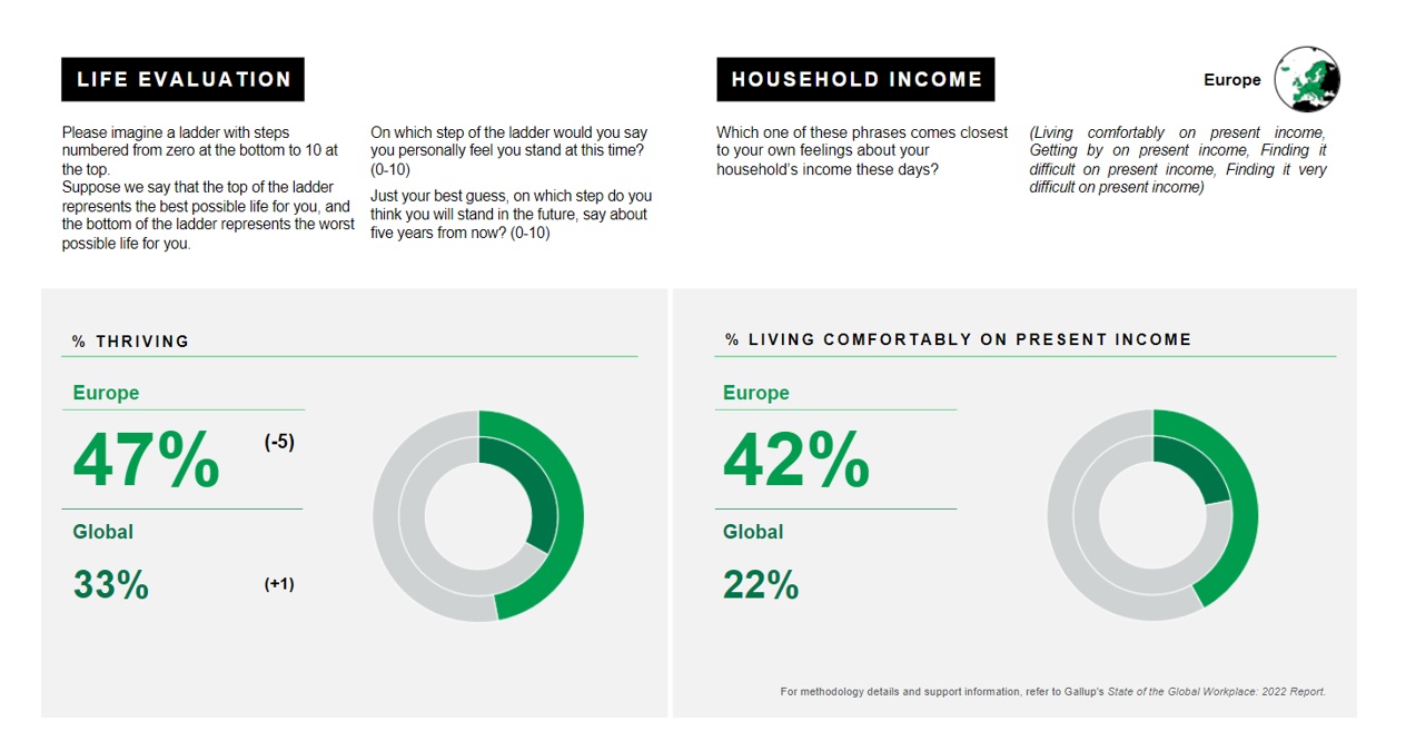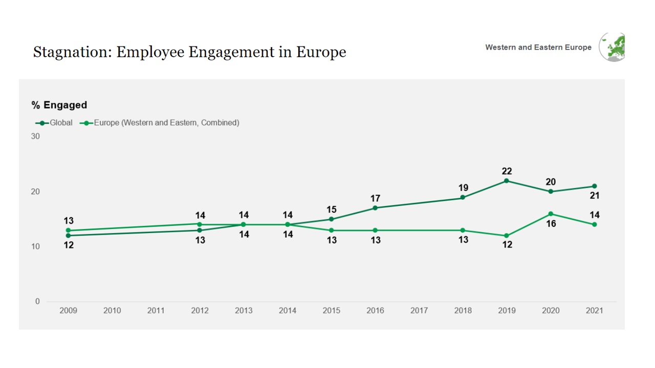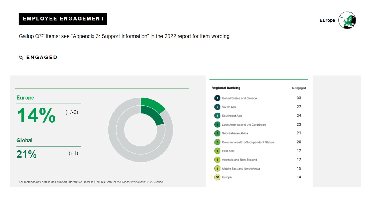 Gallup ondervraagt jaarlijks meer dan honderdduizend medewerkers over de ganse wereld over hoe ze zich voelen omtrent hun werk en hoe geëngageerd ze zich voelen. Het laatste rapport “The State of the Global Workplace 2022“ schetst jammer genoeg een grimmig beeld wat de situatie in Europa betreft.