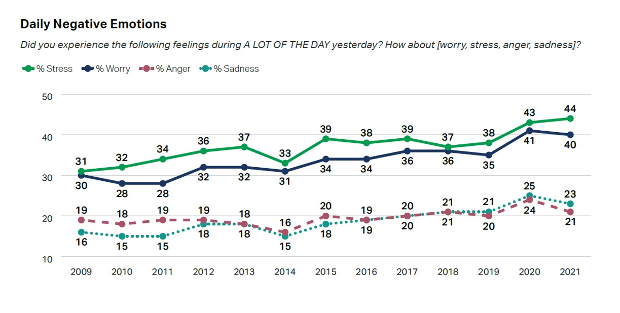 Dat de pandemie een stevige impact had op het mentale welzijn overal ter wereld is niet verrassend en blijkt ook duidelijk uit de cijfers. De stress-cijfers bereikten een absolute recordhoogte in 2020 en stegen zelfs nog verder door in 2021!