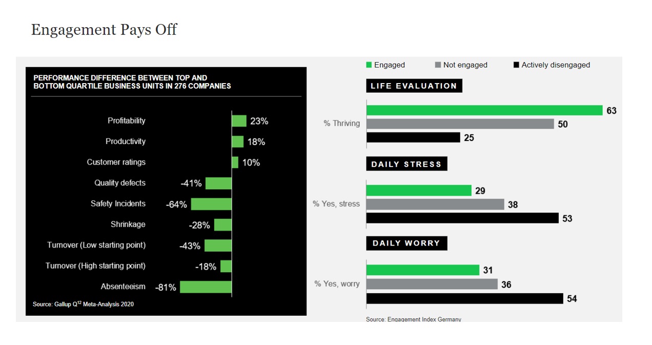 Bedrijven die het belang van engagement erkennen en de relatie tussen de leidinggevende en de medewerker als de grootste drijfveer ervan kunnen profiteren van de positieve impact die investeren in employee engagement met zich meebrengt, zoals onder andere