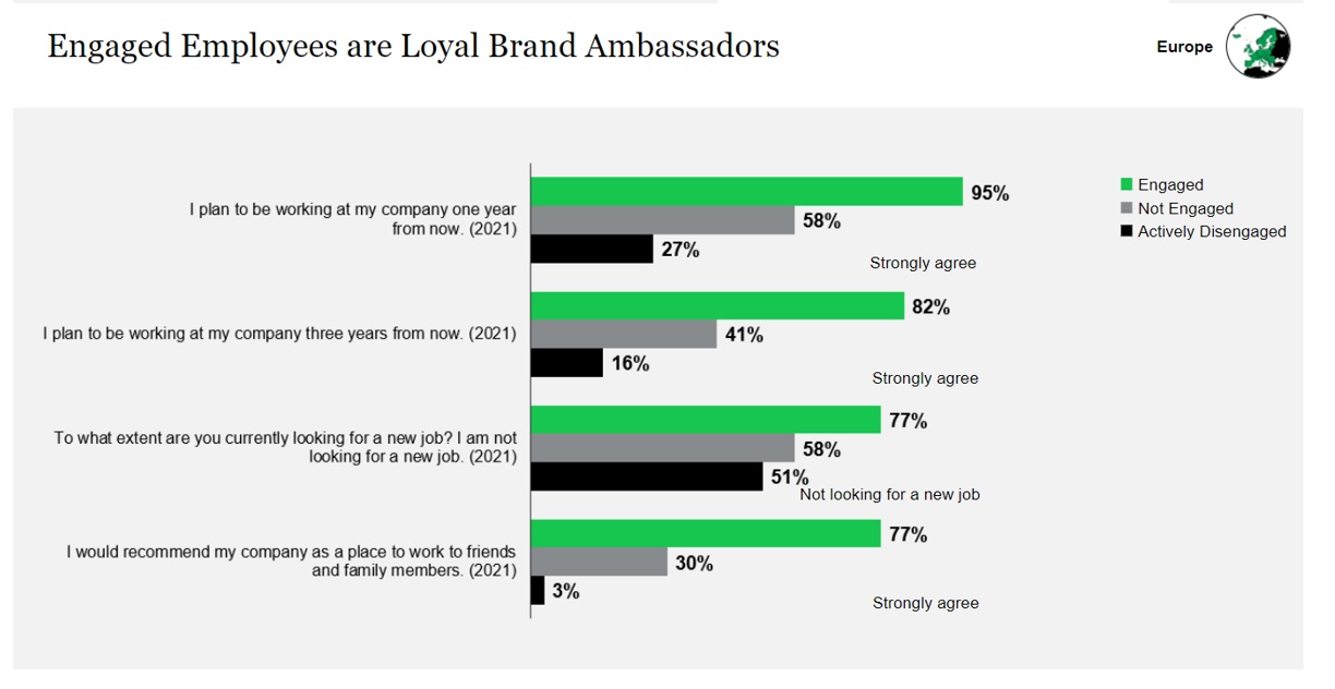 De cijfers tonen aan dat de eerder vermelde relatieve hoge scores qua levenskwaliteit in Europa, zich jammer genoeg niet vertalen naar de werkvloer. Europa heeft met 14% de laagste employee engagement cijfers van alle continenten, een stevige 7% lager dan het globale gemiddelde!